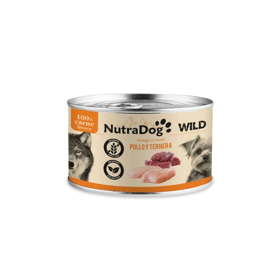 El NutraDog WILD Pollo y Ternera 8x200g es un alimento húmedo natural para perros, formulado para ofrecer una nutrición completa, equilibrada y altamente apetecible.