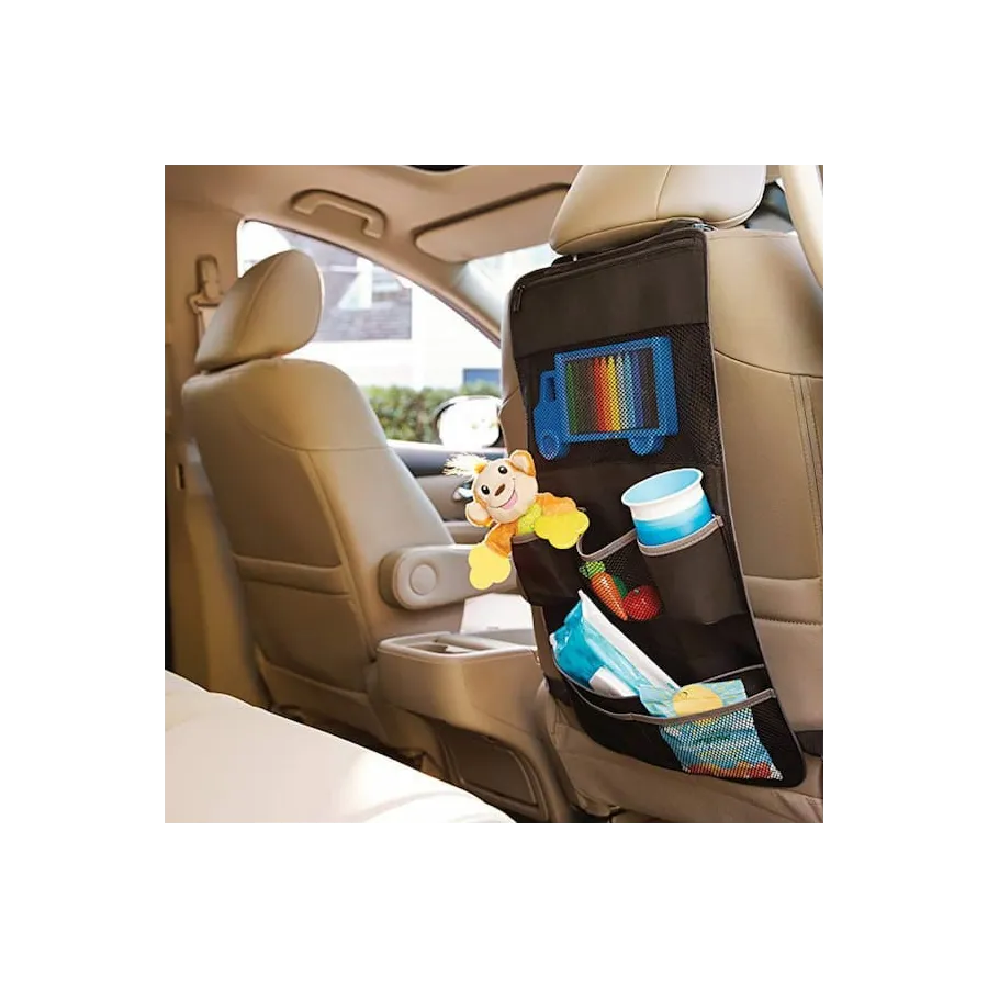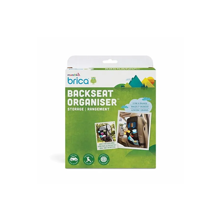 Con el organizador de coche BRICA de Munchkin el paseo te resultará un poco más fácil ya que en el coche, puedes tener ordenados los juguetes, biberones, libros, botellas de agua, pañales, toallitas y todas las cosas que necesitas en el coche a la vez que proteges la tapicería.