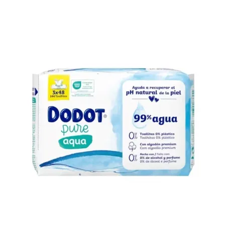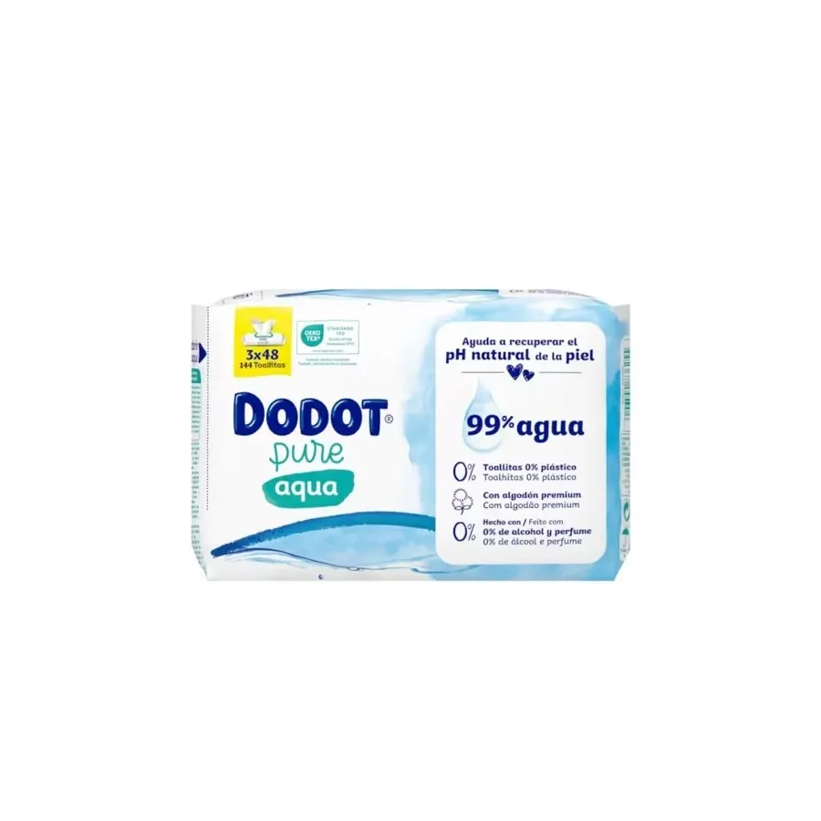 Las toallitas Dodot Aqua Pure están elaboradas con 99% de agua purificada y algodón de origen vegetal, libres de alcohol, perfumes y plásticos, lo que las convierte en una opción hipoalergénica y segura desde el primer día de vida. Llévatelas ahora con envío en 24/72 horas y cuida la piel de tu bebé con la pureza que se merece.