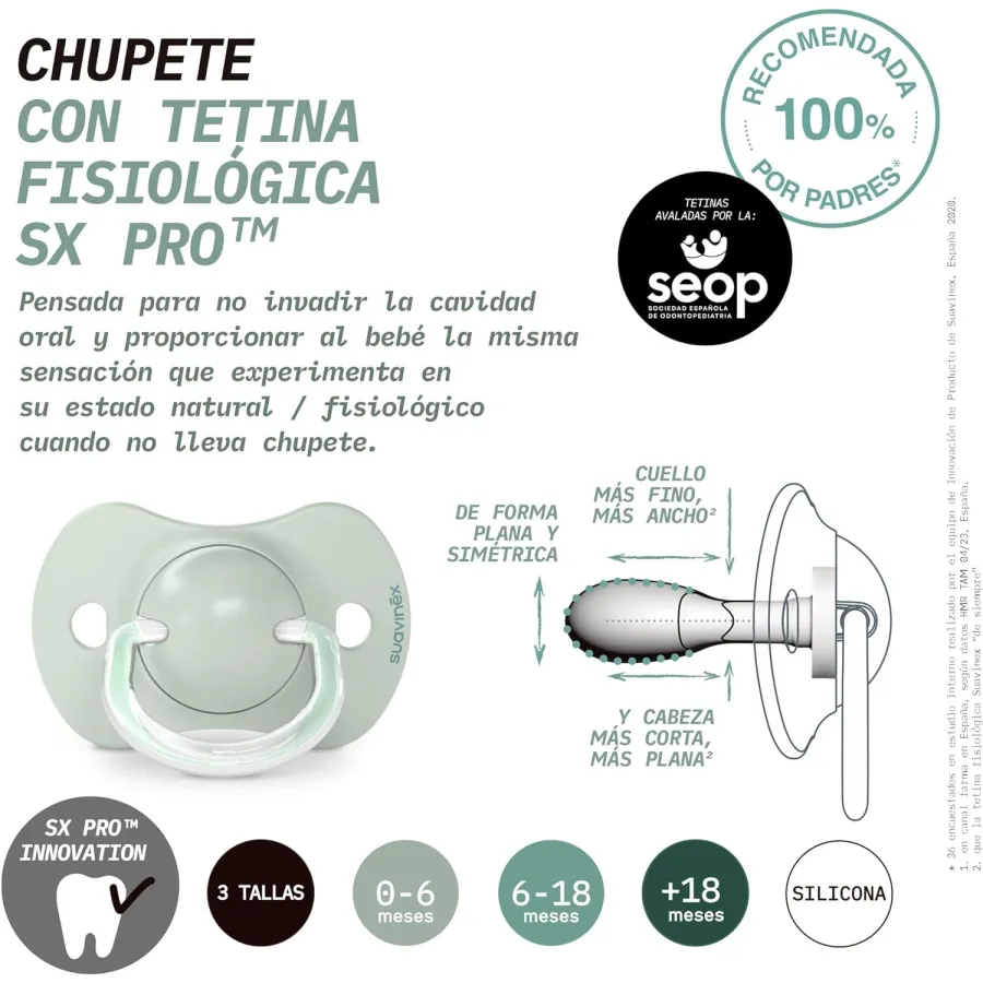 Suavinex presenta los nuevos chupetes con tetina fisiológica SX Pro para que puedas estar tranquila, aunque tu peque no pueda separarse de su chupete. La tetina fisiológica SX Pro es una tetina simétrica de silicona con textura arenada que simula el pecho de forma muy lograda. Gracias a su diseño, permite que el bebé mantenga la posición bucodental natural en todo momento como si no llevase chupete minimizando la presión sobre el paladar y las encías consiguiendo respetar el desarrollo maxilofacial natural.