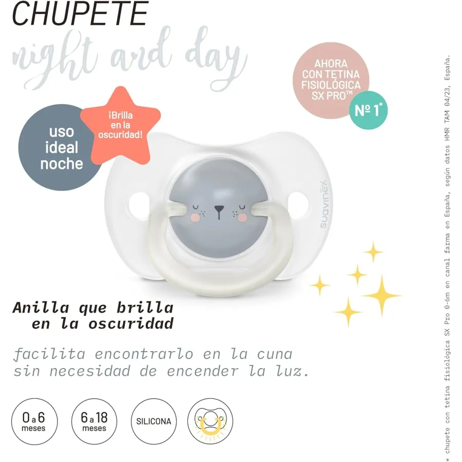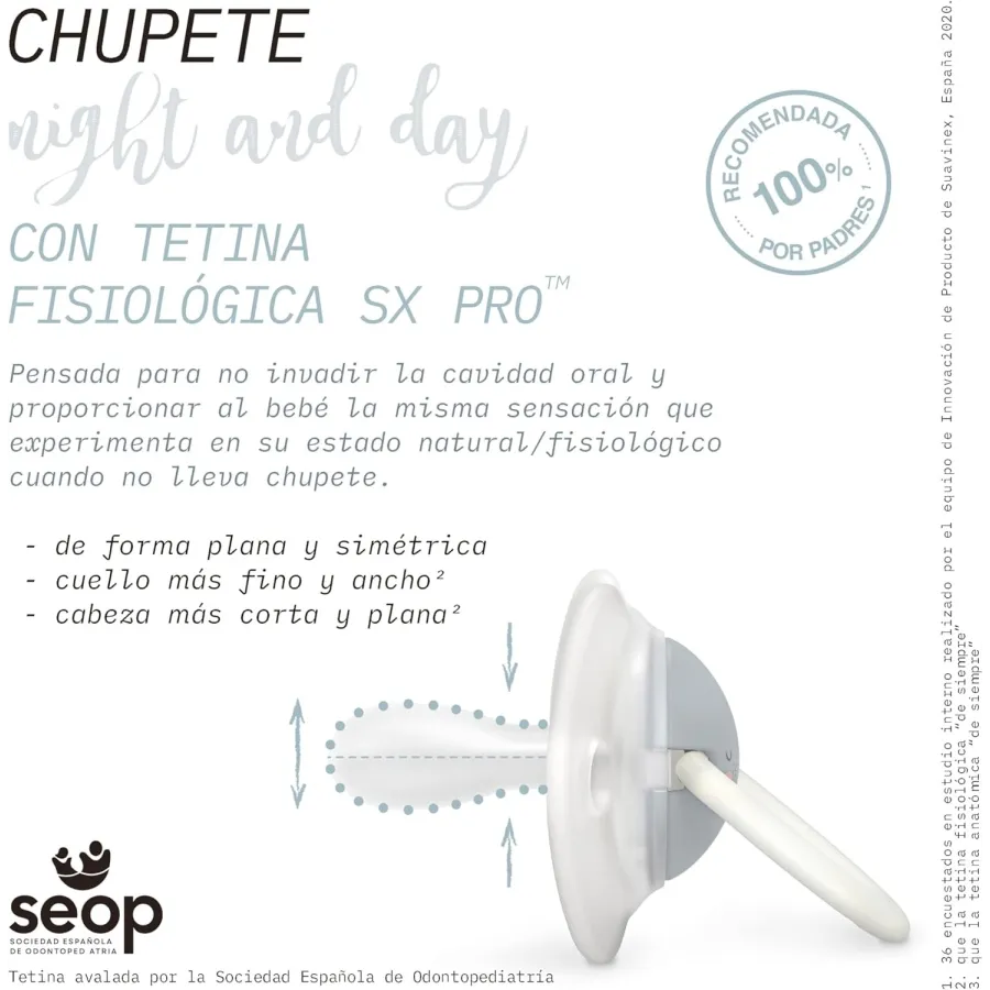 La innovadora tetina fisiológica SX Pro de Suavinex ha sido diseñada por expertos y avalada por la Sociedad Española de Odontopediatría para minimizar el impacto del uso del chupete sobre el desarrollo maxilofacial y bucodental del bebé. Gracias a su forma con cabeza más corta, simétrica y plana y su cuello más ancho y fino, permite al bebé mantener la posición natural de la boca durante su uso igual que si no lo llevase. La silicona empleada de altísima calidad, fina, cálida, muy flexible y con acabado arenado logrando imitar fielmente el pezón materno. Con la succión se adapta a la cavidad oral del bebé sin presionar. Gracias a su forma simétrica el chupete siempre está correctamente colocado en la boquita del bebé, aunque se lo ponga del revés. Son perfectos para la noche porque cuentan con una anilla que brilla en la oscuridad permitiendo localizarlos fácilmente sin encender la luz.