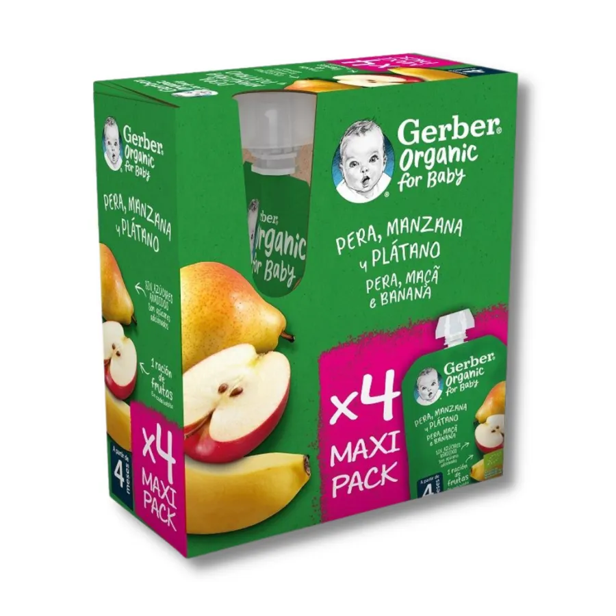 ¡Descubre el delicioso y nutritivo pack de 4 bolsitas Gerber, una opción ideal para la alimentación de tu bebé! Cada bolsita contiene una mezcla sabrosa de pera, manzana y plátano, cuidadosamente elaborada para ofrecer una experiencia de sabor única y saludable.