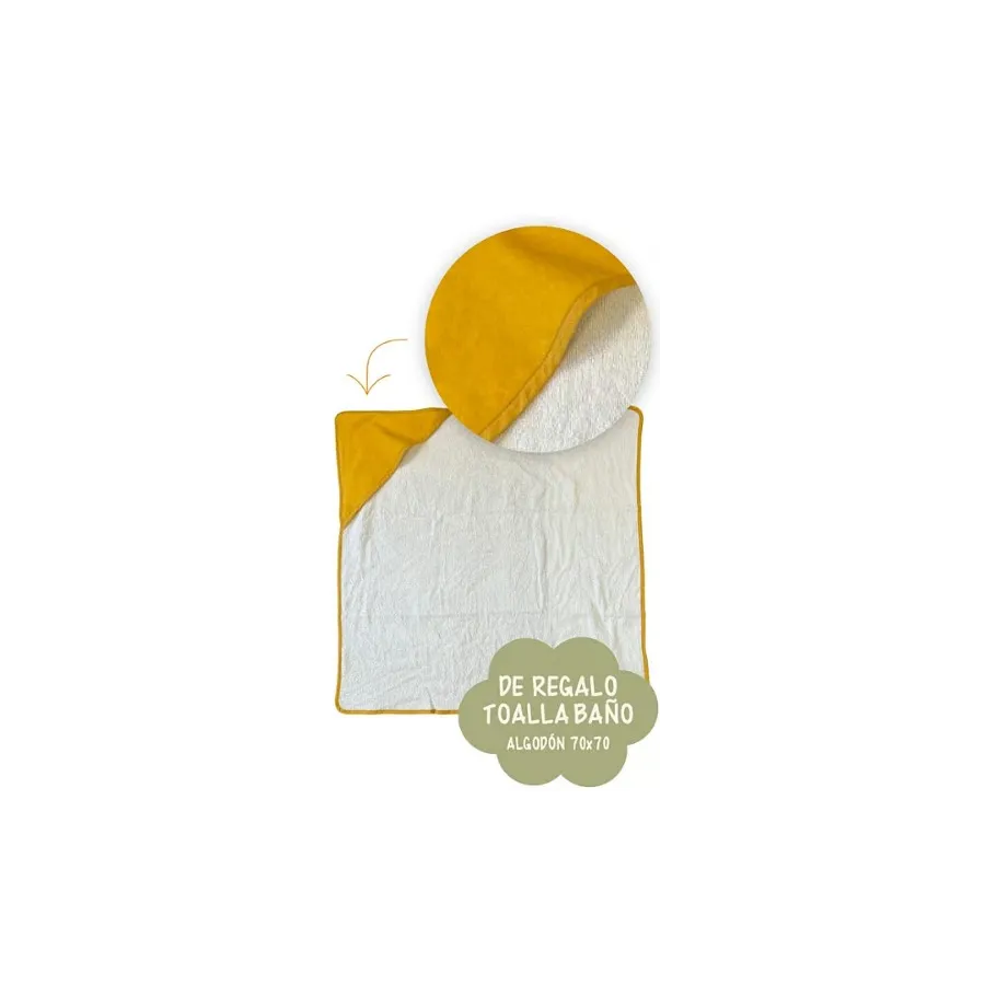 Además, incluye una preciosa toalla de algodón 70x70, suave y absorbente, perfecta para envolver a tu bebé después del baño y prolongar ese momento de calidez y protección.