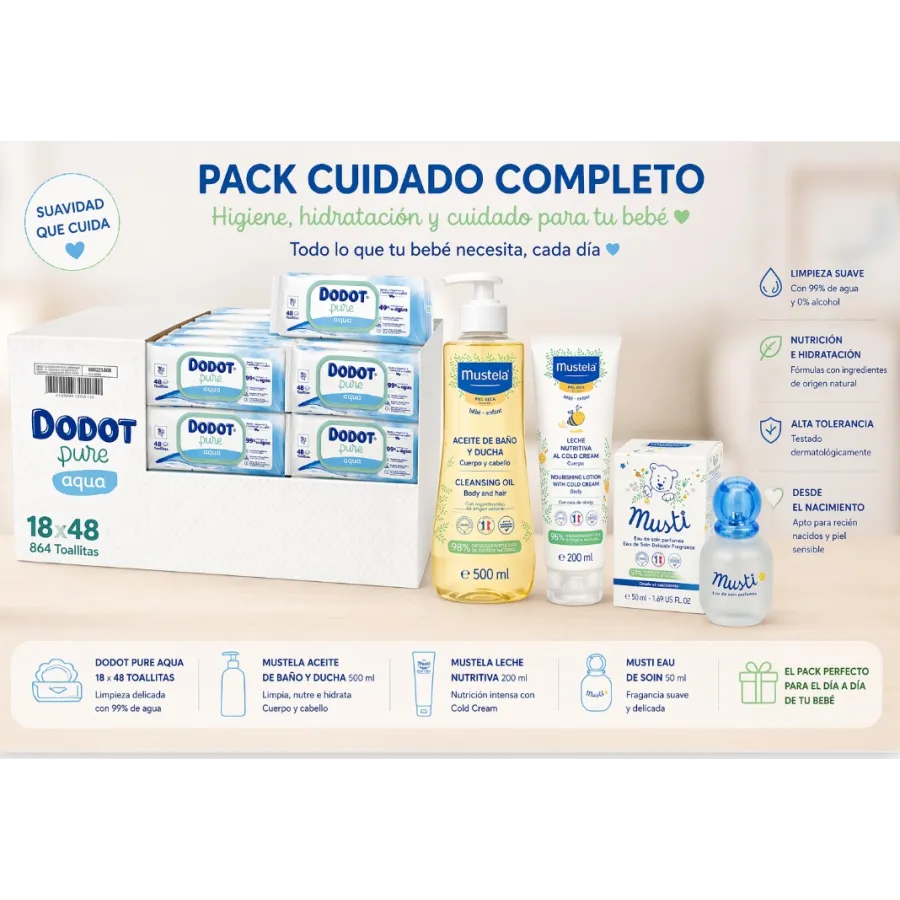Este pack combina productos esenciales de Dodot y Mustela para ofrecer una rutina completa de higiene, hidratación y protección diaria ✨