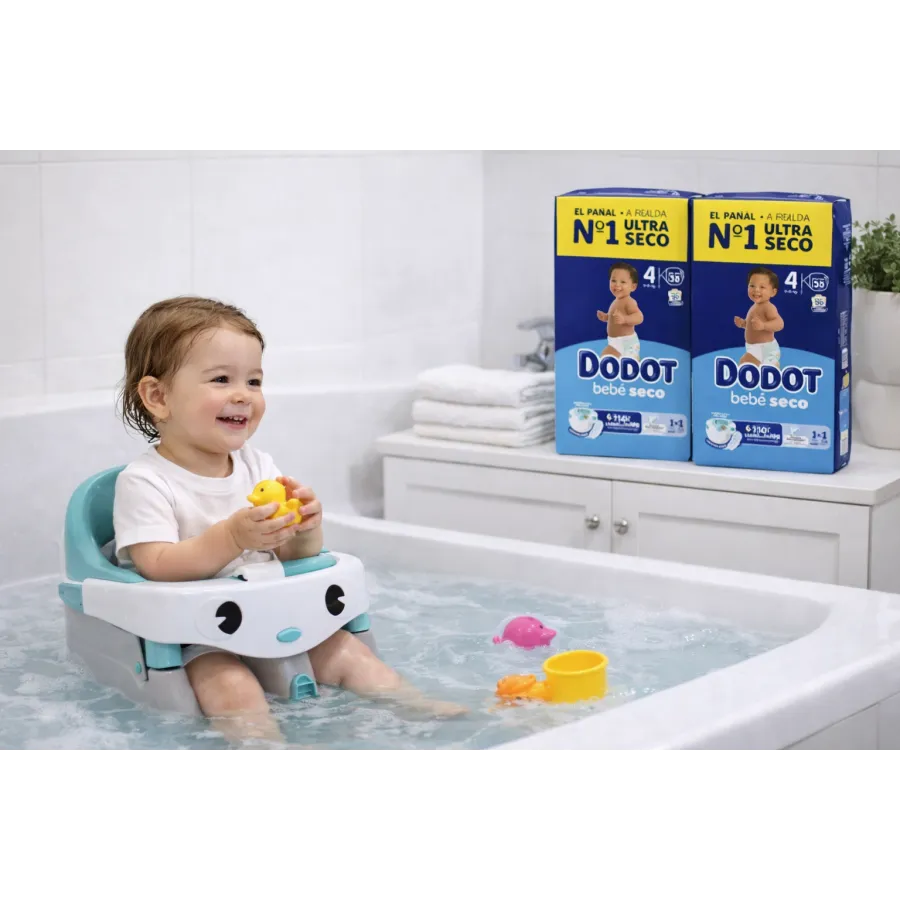 El asiento permite que el bebé disfrute del baño de forma cómoda y segura, gracias a su sistema de fijación con ventosas y su diseño ergonómico. Por su parte, los pañales Dodot garantizan máxima absorción y protección antifugas, manteniendo la piel seca durante más tiempo.