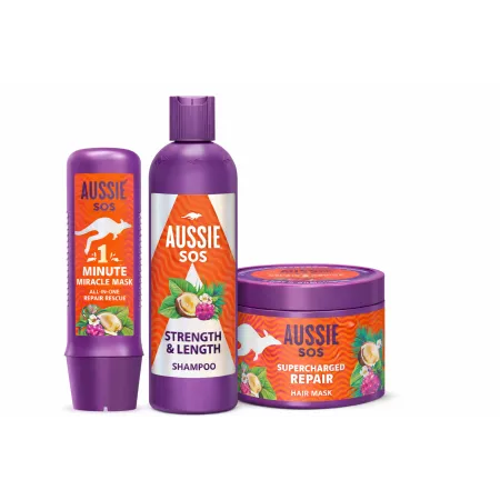 El pack incluye el Champú Aussie SOS Strength & Length, que limpia suavemente mientras ayuda a fortalecer la fibra capilar; la Mascarilla Aussie SOS Supercharged Repair, un tratamiento intensivo que nutre profundamente el cabello; y la Mascarilla 1 Minute Miracle Mask All-in-One Repair Rescue, un tratamiento rápido que actúa en solo un minuto para ayudar a reparar el cabello maltratado.