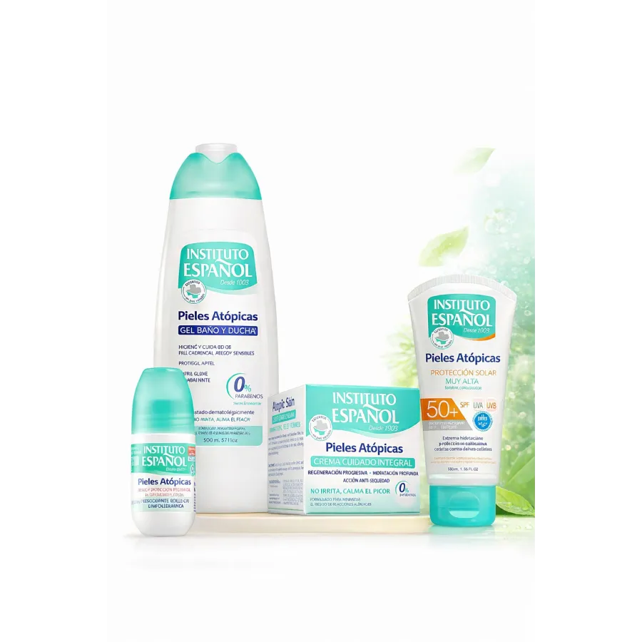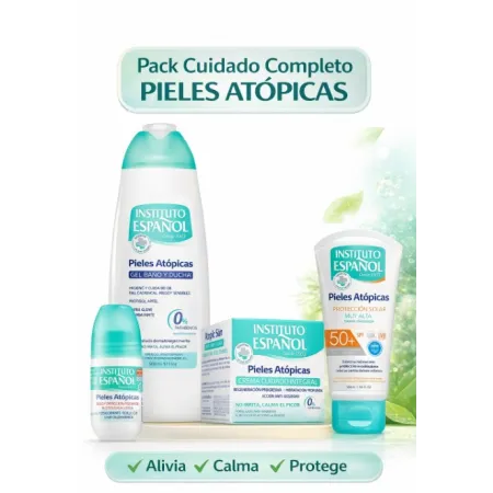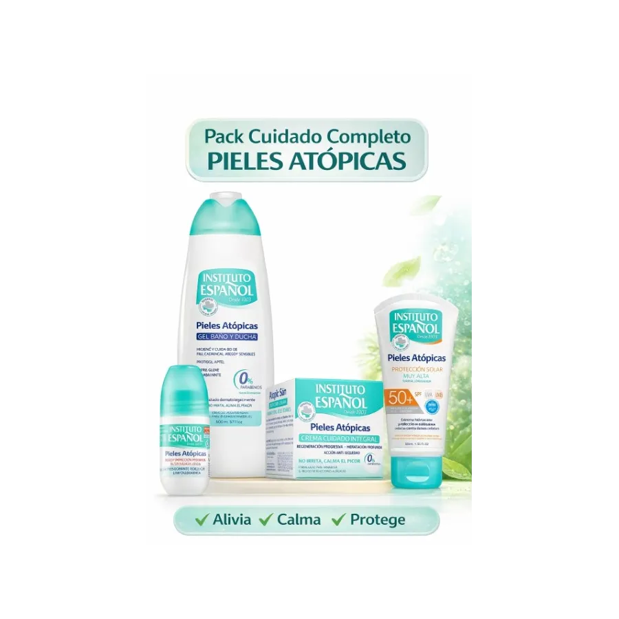 El Pack Piel Atópica de Instituto Español reúne los esenciales para una rutina completa de cuidado diario: gel de baño, crema corporal, desodorante y protector solar SPF50 (1510 ml).