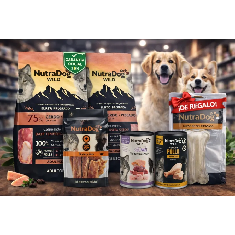 🐶 PACK SÚPER AHORRO – NutraDog Cerdo y Pescado + Latas Gourmet + Snack + ¡Hueso GRATIS!