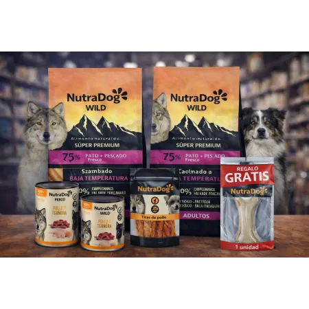 🐶 PACK SÚPER AHORRO – NutraDog Pato y Pescado + Latas Naturales + Snack + ¡Hueso GRATIS!