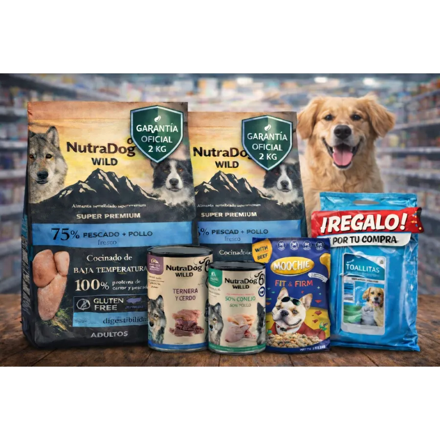 🐶 PACK SÚPER AHORRO – NutraDog Pescado y Pollo + Latas Gourmet + Pouch + ¡Toallitas GRATIS!