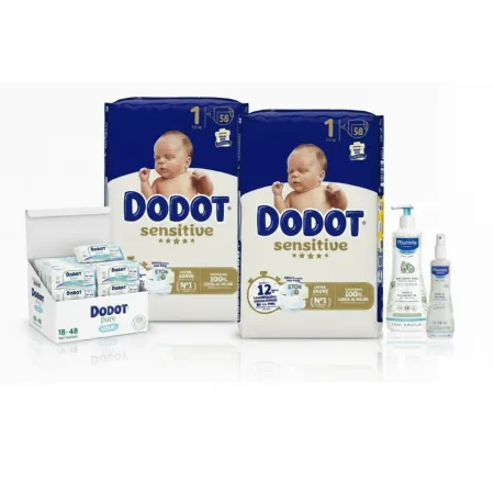 Pack Súper Ahorro: Pañales dodot sensitive talla 1 + Toallitas Dodot Pure + Gel de baño Mustela + Colonia Mustela