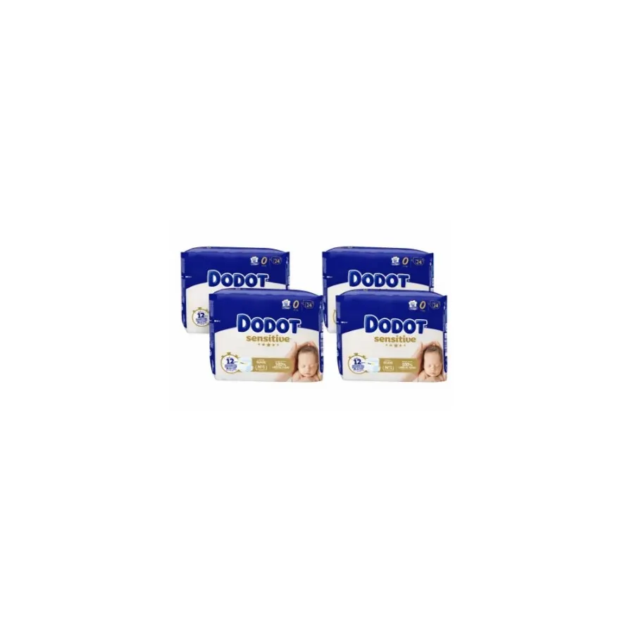 Este pack incluye 4 paquetes de pañales Dodot Sensitive talla 0, especialmente diseñados para la piel delicada de los recién nacidos.