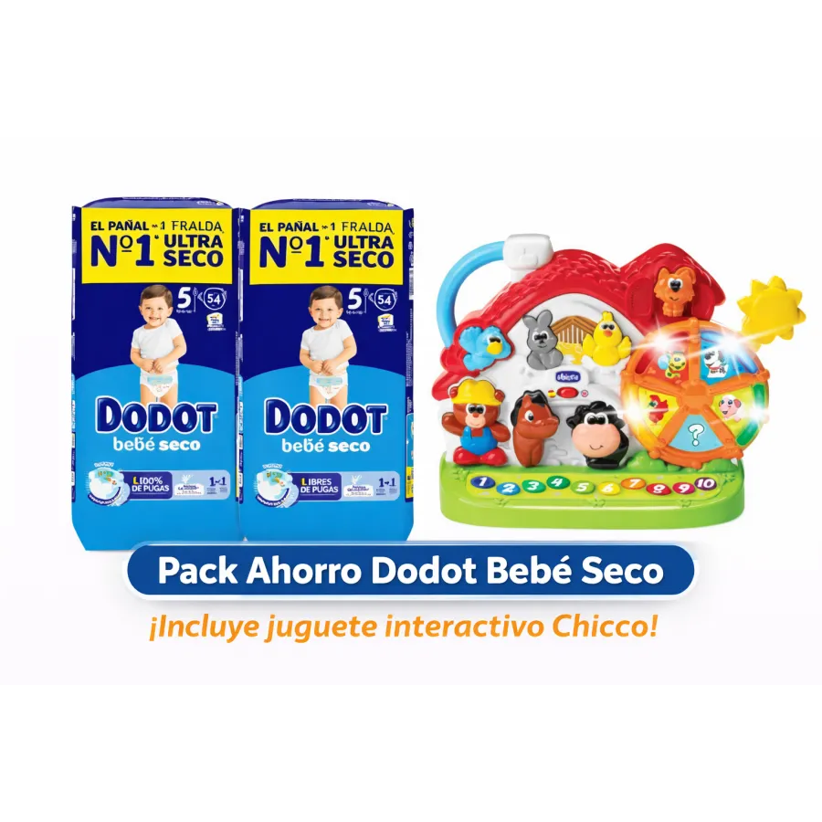 Este pack combina lo mejor para el día a día del bebé: protección con pañales Dodot Bebé Seco Talla 5 (2 paquetes de 58 unidades) y aprendizaje con la Granja Bilingüe Chicco.