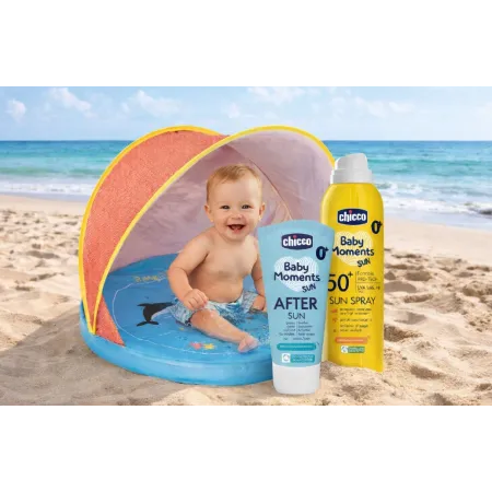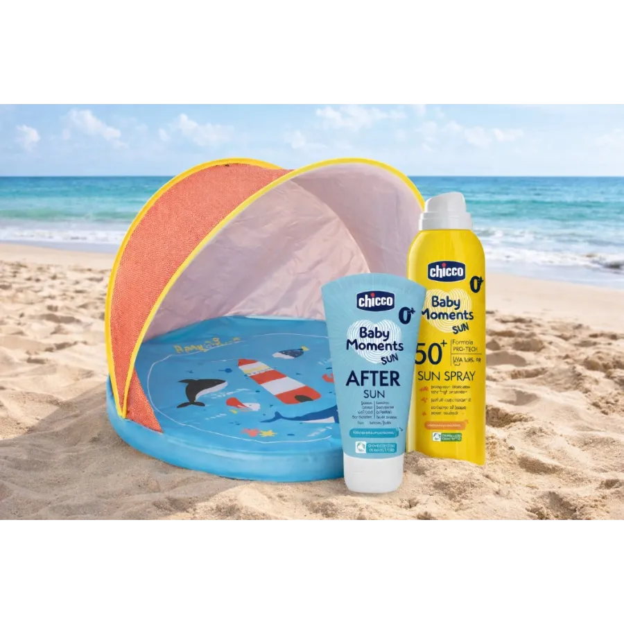 Incluye una tienda con protección solar para crear un espacio seguro, junto con el protector solar SPF 50+ Chicco y el after sun calmante, ideales para mantener la piel del bebé protegida e hidratada.
