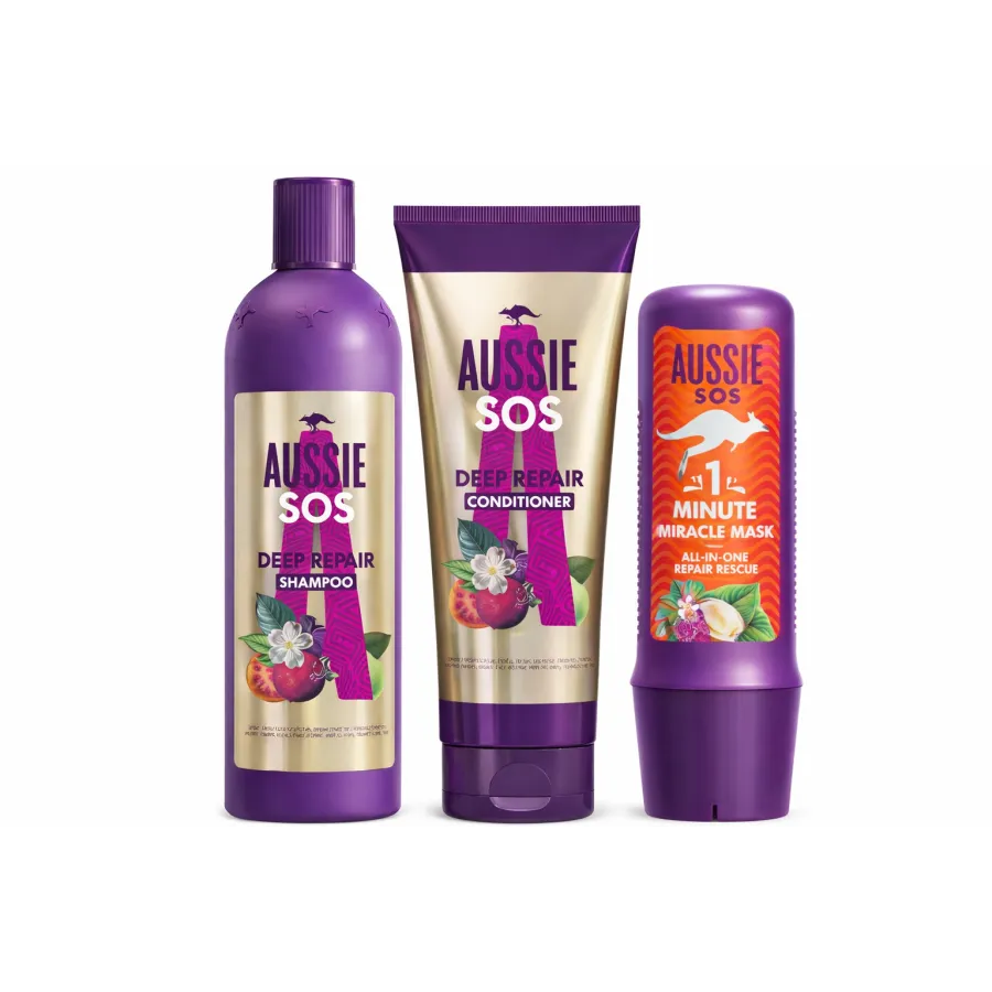 El pack incluye el Champú Aussie SOS Deep Repair , que limpia suavemente mientras nutre el cabello; el Acondicionador Deep Repair, que ayuda a hidratar y desenredar; y la Mascarilla 1 Minute Miracle Mask All-in-One Repair Rescue, un tratamiento intensivo que actúa en solo un minuto para reparar el cabello seco o maltratado.