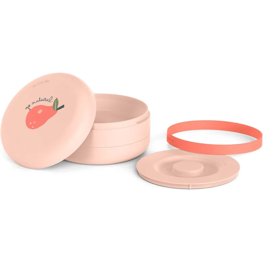 Incluye plato tipo bento, cucharas portátiles y vaso de aprendizaje, pensados para fomentar la autonomía y mantener la rutina alimentaria en cualquier momento del día.
