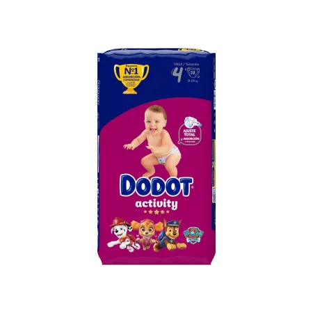 Pañales Dodot Activity Talla 4 (9 kg a 14 kg) estos pañales son perfectos para la etapa de crecimiento en que tu pequeñín comienza a moverse solo por la casa. Con Dodot Activity le brindarás la mayor comodidad y confort para que viva miles de aventuras sin que nada lo detenga. Gracias a sus tubos ultra absorbentes que ayudan a distribuir el pis evitando que el pañal cuelgue y a su exclusiva suave capa absorbente e indicador de humedad, serán tus perfectos aliados.
