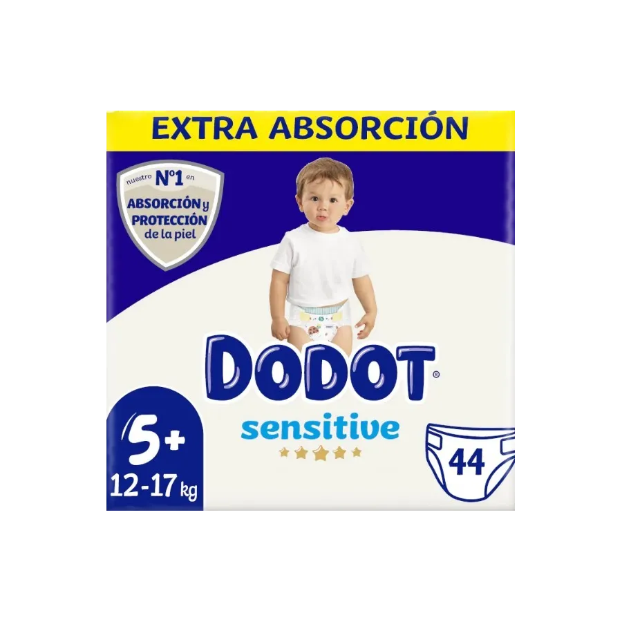 Los pañales Dodot Sensitive Extra Talla 5+ (12-17 kg) fueran especialmente diseñados para bebés de 12 kg a 17 kg. Protege la piel sensible de tu peque y proporciona la máxima absorción de pipis y caquitas líquidas, evitando que haya los temidos escapes.