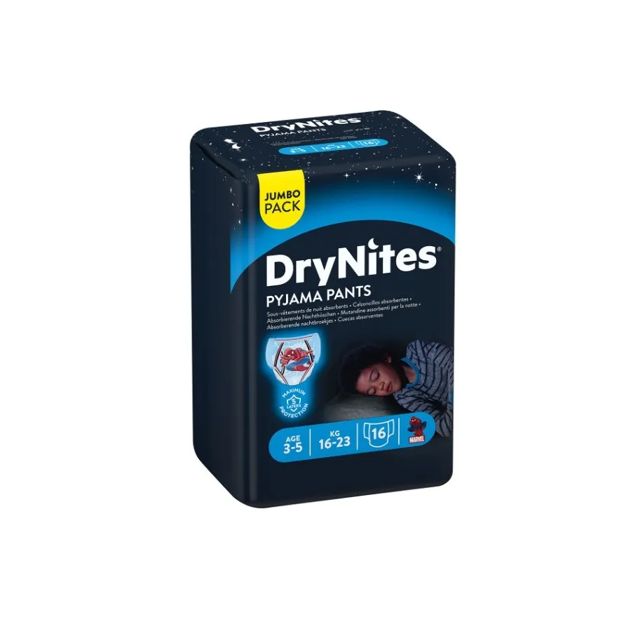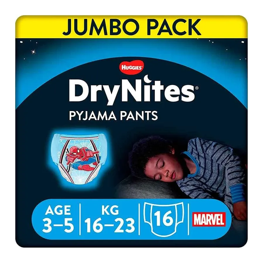 Los pañales nocturnos DryNites de Huggies (versión niño 3-5 años) están diseñados para niños que ya no usan pañal durante el día, pero pueden presentar escapes nocturnos.