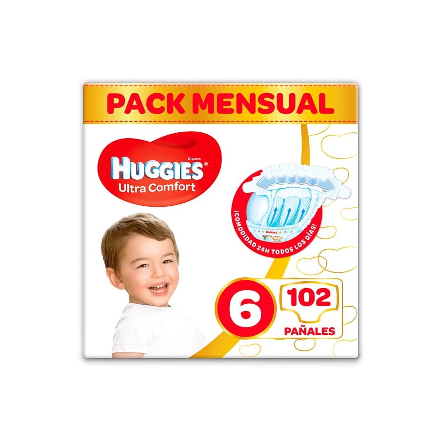 Pañales Huggies Ultra Confort Talla 6. Pack Ahorro 102 und. 0.381€ / unidad