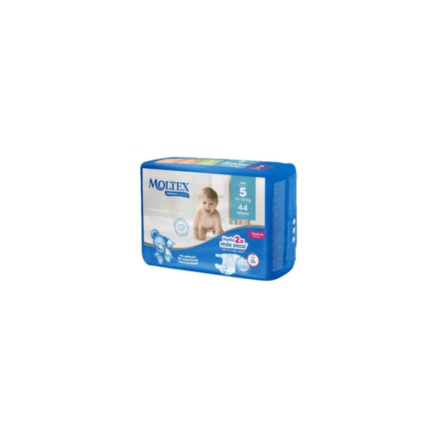 Los Pañales Premium de Moltex talla 5, 44 Uds., proporcionan un ajuste total con cintura y bandas elásticas, diseño anatómico más estrecho en la entrepierna para adaptarse a los movimientos del bebé, dermo protección con aloe vera, manzanilla y vitamina E.