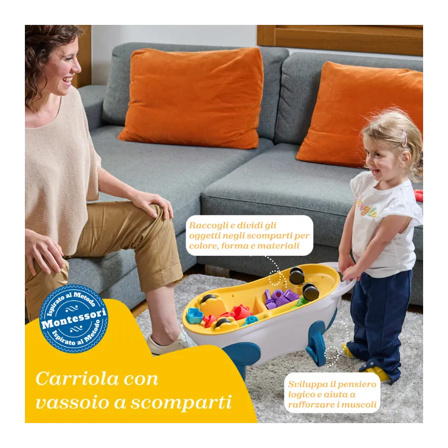 Con botones, sonidos, luces y texturas, el panel frontal ofrece una estimulación multisensorial clave en los primeros años. Una auténtica carretilla educativa Chicco.