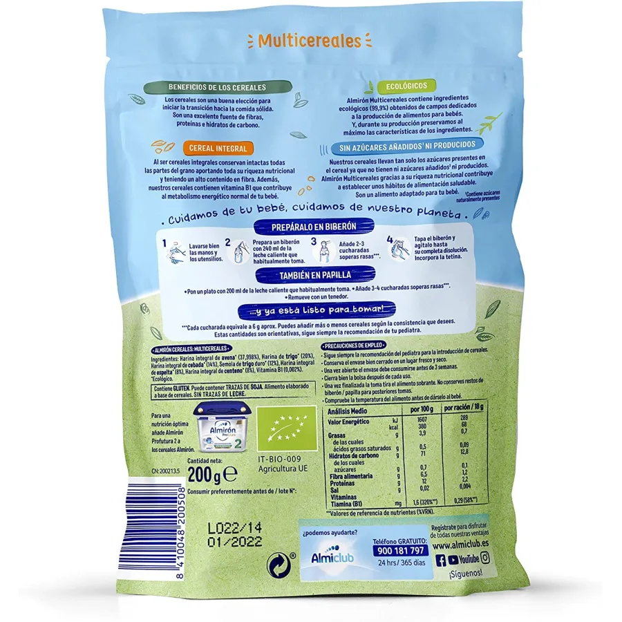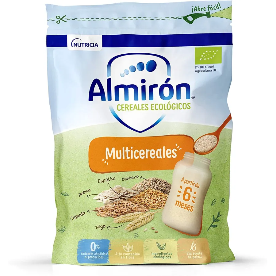 Almirón multicerales ecológicos está elaborado con cereales integrales no refinados conservan todas las propiedades nutricionales y un alto nivel de fibra. Provienen de la agricultura ecológica y son la solución ideal para diversificar y enriquecer la dieta del bebé a partir de los 6 meses. Perfectos para la transición hacia la alimentación sólida.