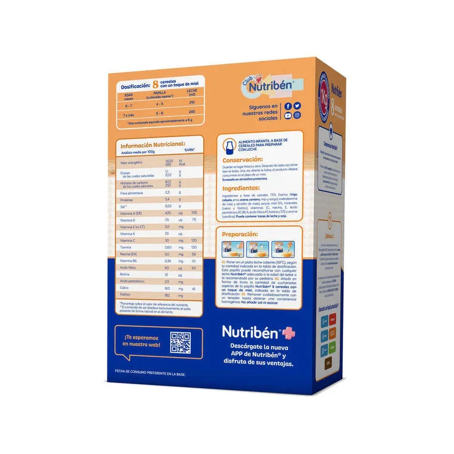 La papilla Nutribén 8 cereales con un toque de miel combina ocho cereales nutritivos con un suave sabor a miel, perfecta para el desayuno de los bebés.