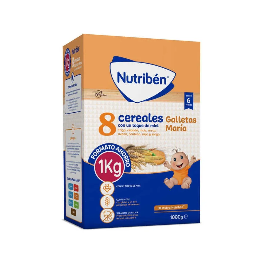 La papilla Nutribén 8 cereales con toque de miel y galleta María es un alimento diseñado para bebés a partir de los 6 meses, que combina una mezcla de ocho cereales con el delicioso sabor de la galleta María y un toque de miel.