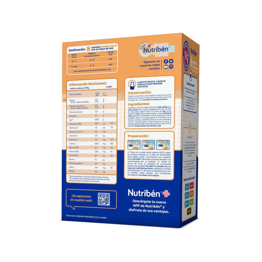 La papilla Nutribén 8 Cereales con Miel y Galletas María combina el poder nutritivo de los cereales con la dulzura de las galletas María y un toque de miel.