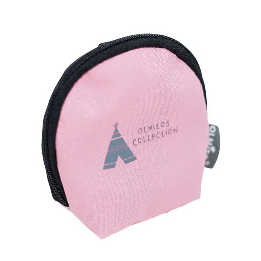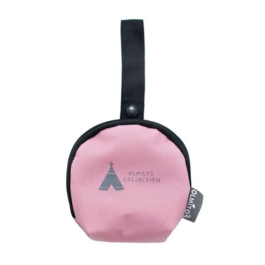 Porta Chupetes Tipi Pink de Olmitos, con cinta para adaptarlo al cochecito o a la bolsa. Es resistente al agua, con asa para colgar con velcro. Precioso color rosa.
