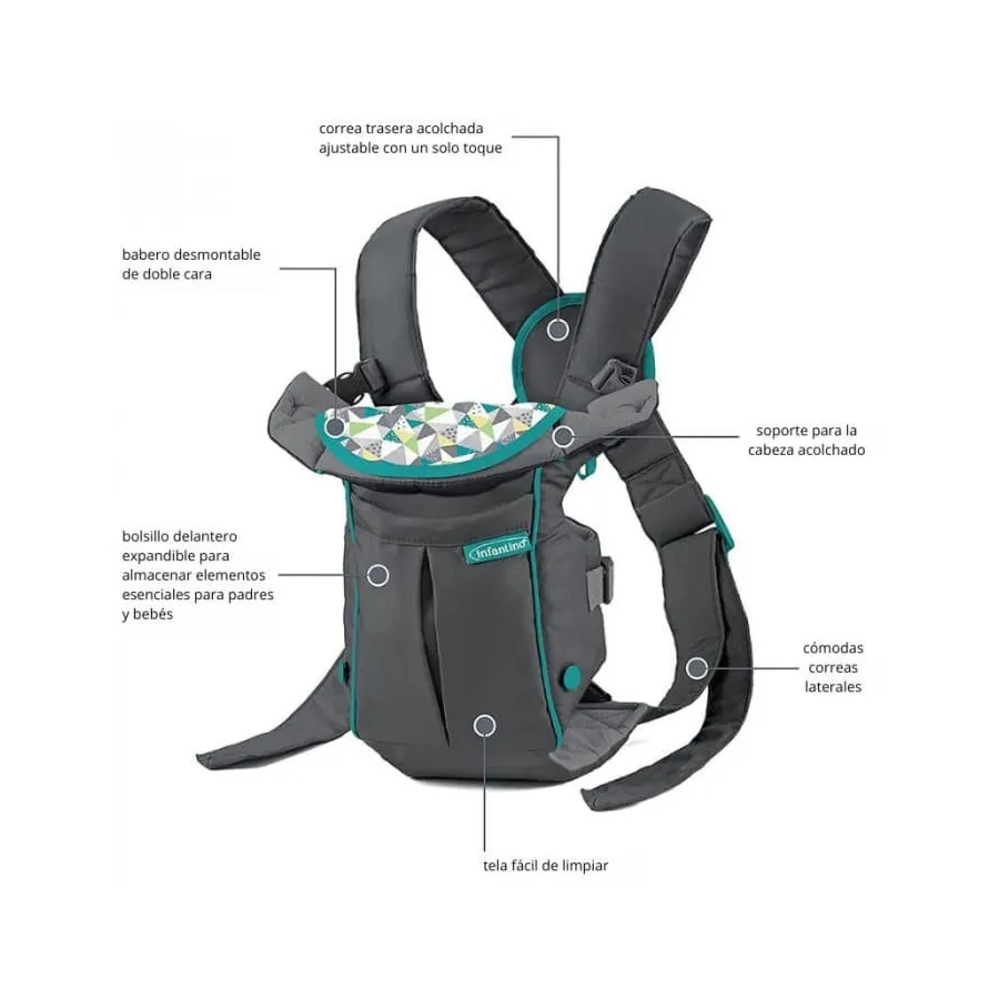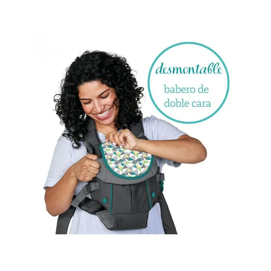 Incluye un babero extraíble Wondercover, que protege el portabebé y la ropita de las babitas y un práctico bolsillo frontal para guardar los efectos personales y básicos del bebé, dejando las manos libres.