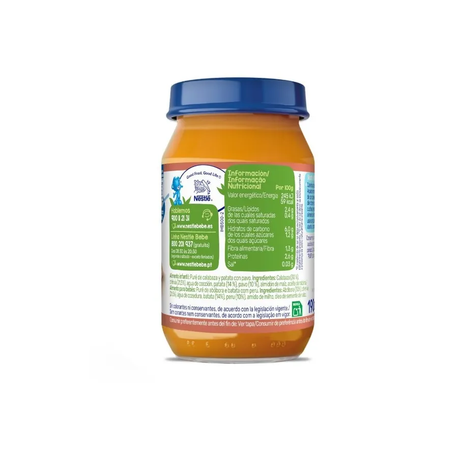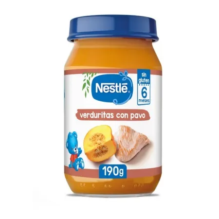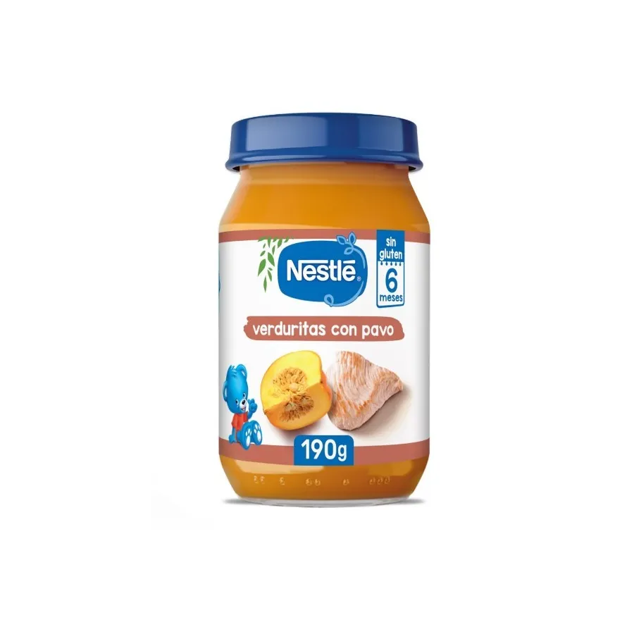 EL potito de NESTLÉ Verduritas con Pavo es una comida nutricionalmente completa y equilibrada para bebés, sin sal añadida, adaptada para bebés a partir de los 6 meses.
