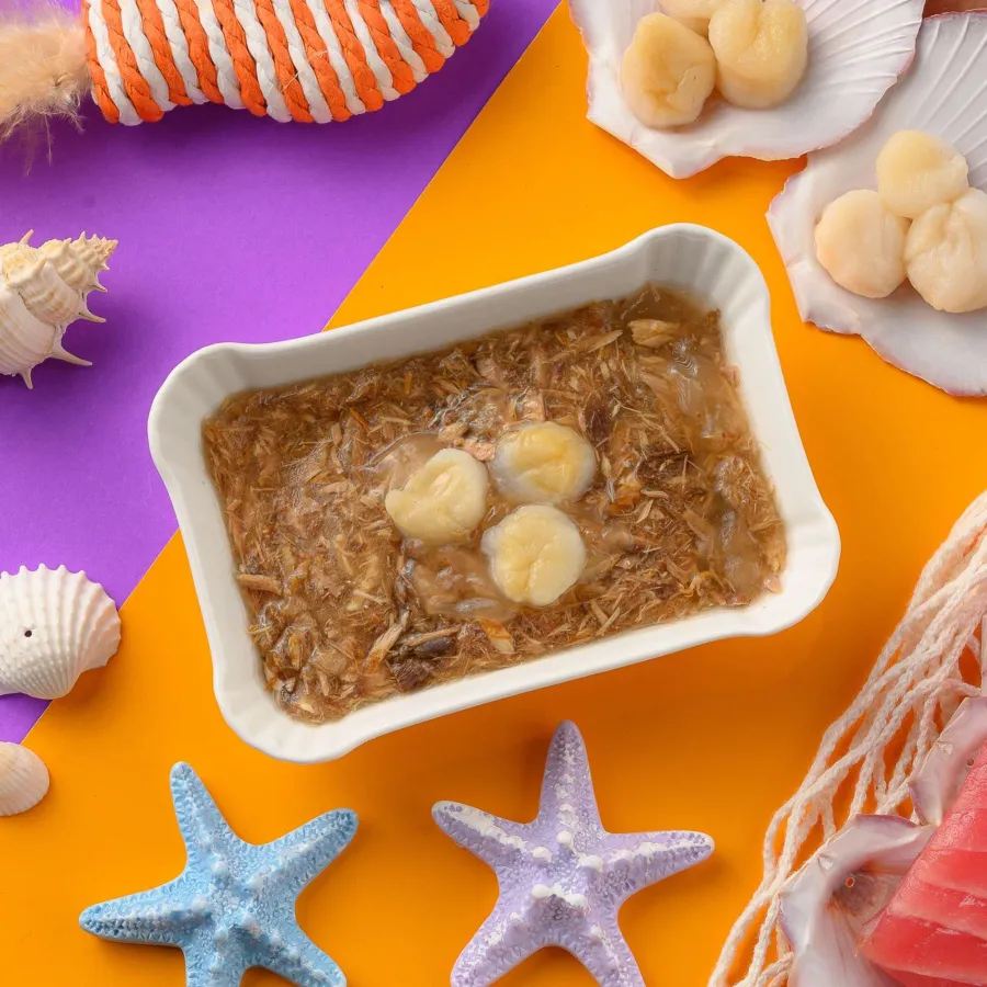 - Atún y vieiras desmenuzadas: Proteínas de alta calidad, ricas en nutrientes esenciales para el bienestar general de tu gato