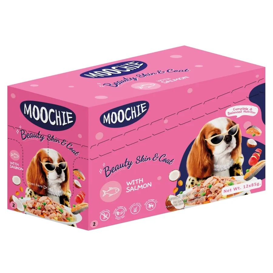 Pouch de salmón y verduras para perros MOOCHIE pelaje radiante. 12 x 85 gr