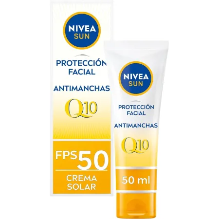La protección facial antimanchas y antiedad Q10 SPF+50 de Nivea Sun es la mejor opción para combatir los efectos nocivos de la radiación solar. Gracias a la combinación de una alta protección solar enriquecida con la coenzima Q10 esta crema de uso diario proporciona protección desde las capas más profundas de la piel, hidratación prolongada y un resultado sedoso para que disfrutes del sol sin preocupaciones y con un rostro rejuvenecido.