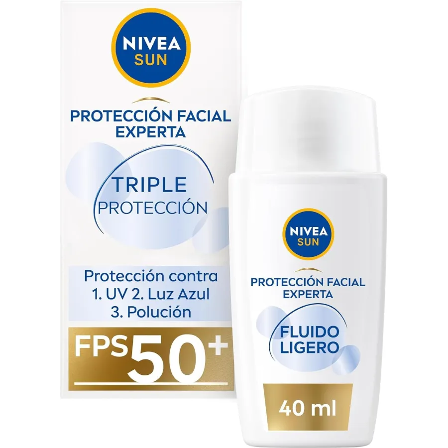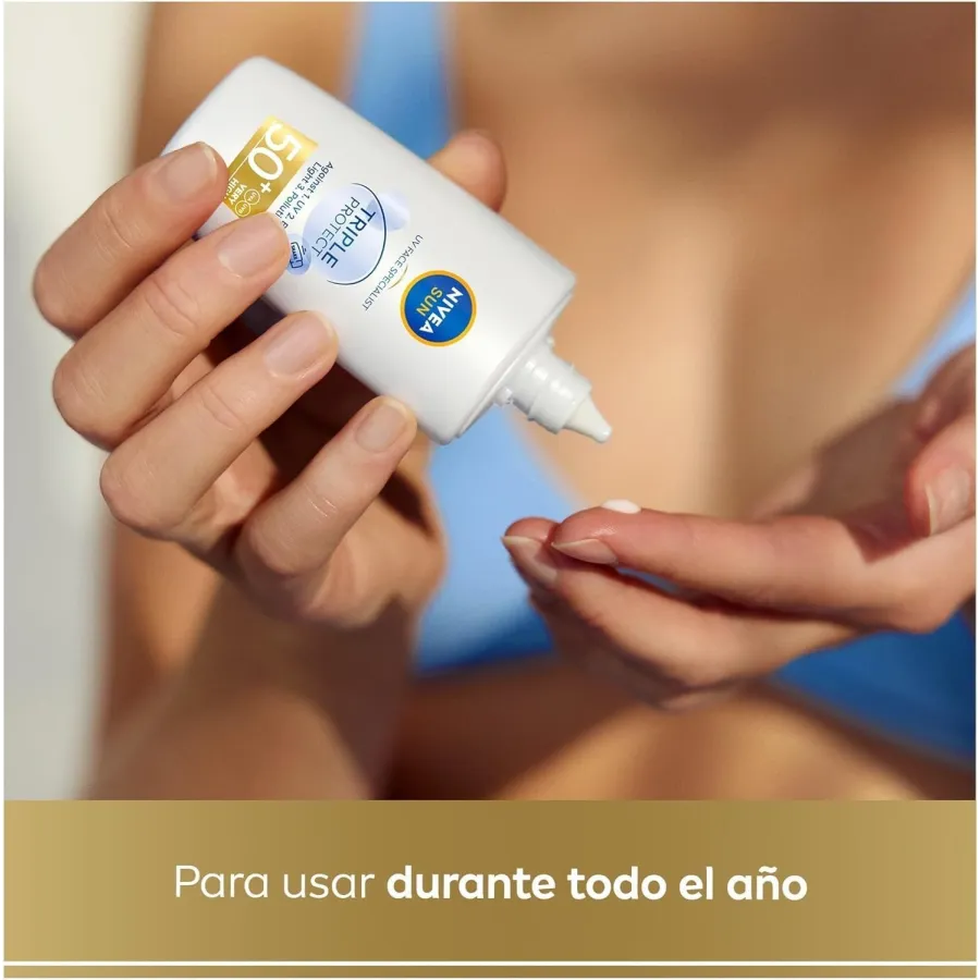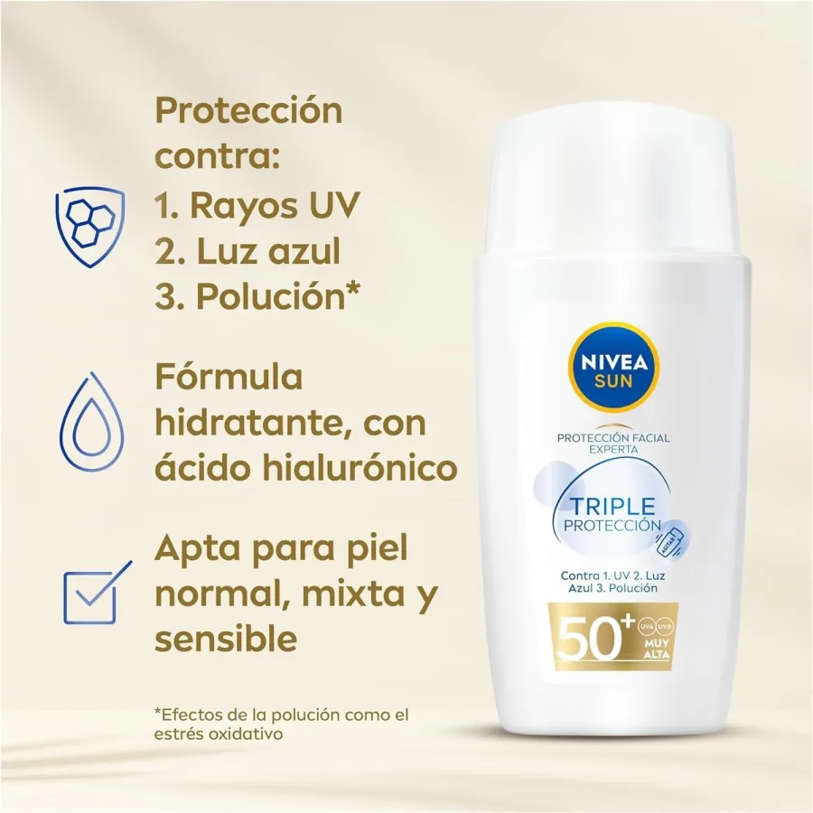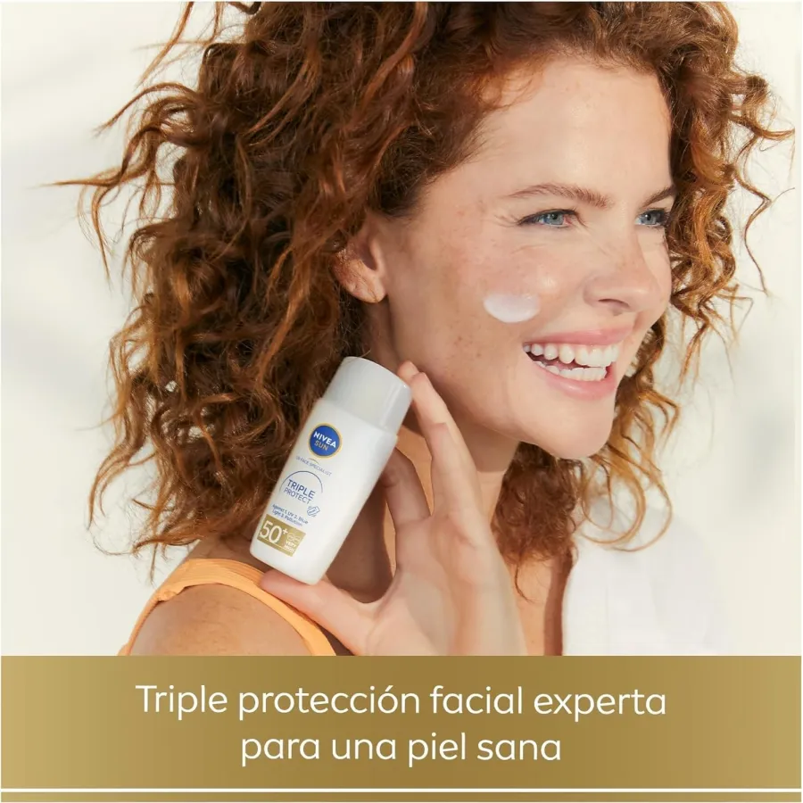 NIVEA SUN Triple Protección Facial Experta 50+, fluido ultraligero hidratante, protector solar facial ultraligero con ácido hialurónico y vitamina E