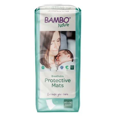 Este pack incluye 10 unidades de protectores de cama Bambo Nature, cada uno de 60x90 cm, con un diseño ecológico, suave al tacto y de alta absorción. Son perfectos para usar en cunas, camas infantiles, cambiadores o incluso sillas de coche.