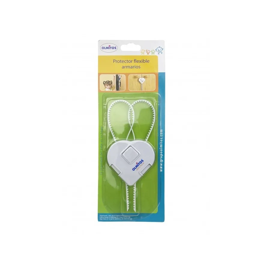 Protector flexible armarios de Olmitos es seguridad para el hogar. Los armarios situados bajo el fregadero de la cocina, o el cuarto de baño, son algunos ejemplos de los lugares en donde los niños pueden verse en apuros o lastimarse. Este sistema de bloqueo evita que los niños abran las puertas. No se necesita herramientas y es fácil de instalar y usar por adultos.