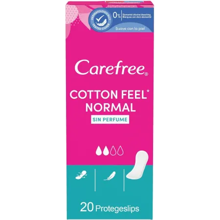El protege slip Carefree Normal es perfecto para el uso diario. Absorbe el flujo impidiendo las manchas en la ropa interior y neutralizando la humedad y el olor. Gracias a su composición con extracto de algodón y que son 100% transpirables brindan un tacto extrasuave y respetuoso cuidando la piel de la zona íntima. Su forma anatómica se adapta al cuerpo aportando una mayor comodidad en el día a día y son tan finos que no notas que los llevas. Cuentan con una alta adherencia para evitar que se muevan y se deformen. Todas estas ventajas lo convierten en la mejor opción para la higiene diaria de la mujer. Paquete de 20 unidades.