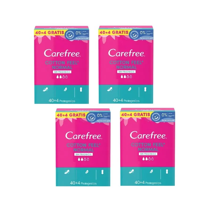 El protege slip Carefree Normal es perfecto para el uso diario. Absorbe el flujo impidiendo las manchas en la ropa interior y neutralizando la humedad y el olor. Gracias a su composición con extracto de algodón y que son 100% transpirables brindan un tacto extrasuave y respetuoso cuidando la piel de la zona íntima. Su forma anatómica se adapta al cuerpo aportando una mayor comodidad en el día a día y son tan finos que no notas que los llevas. Cuentan con una alta adherencia para evitar que se muevan y se deformen. Todas estas ventajas lo convierten en la mejor opción para la higiene diaria de la mujer. Paquete de 40 +4 unidades gratis.
