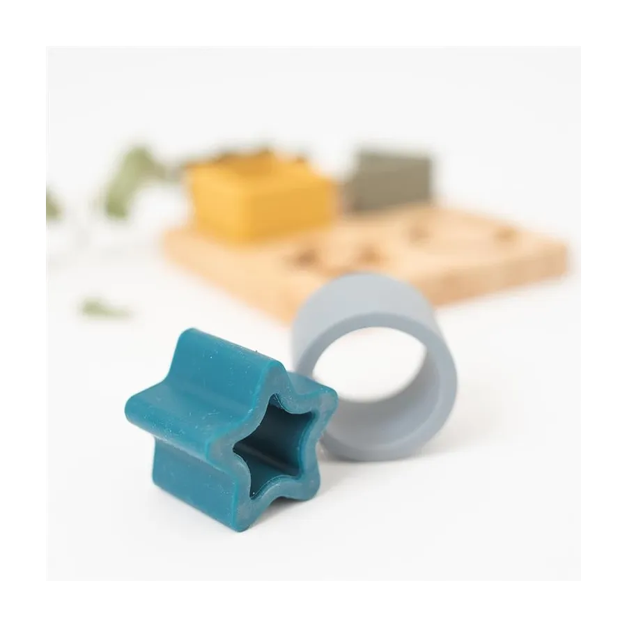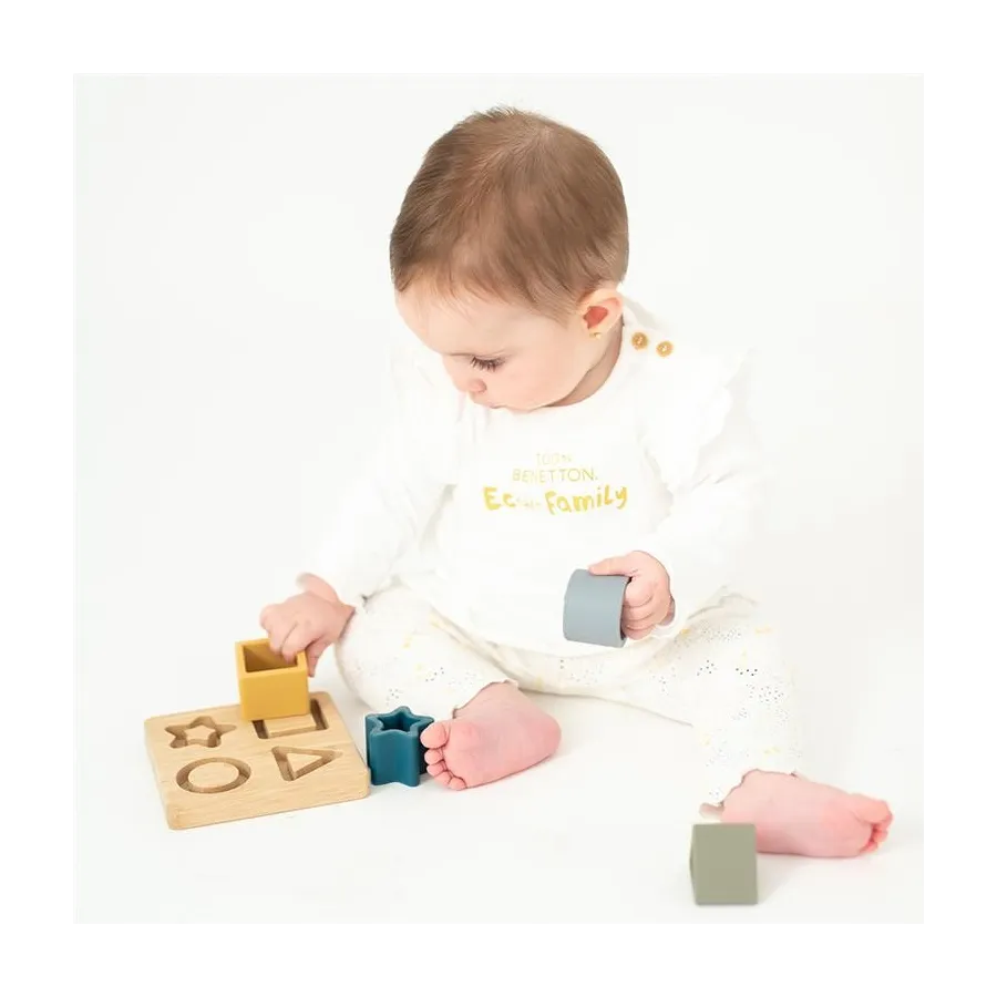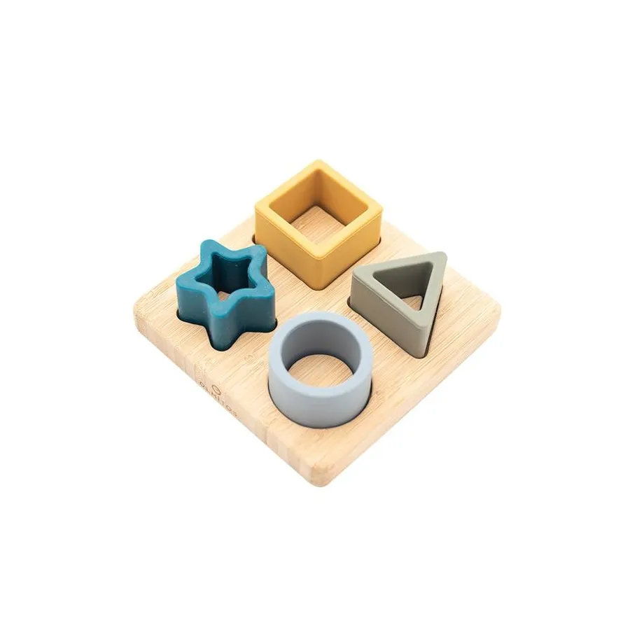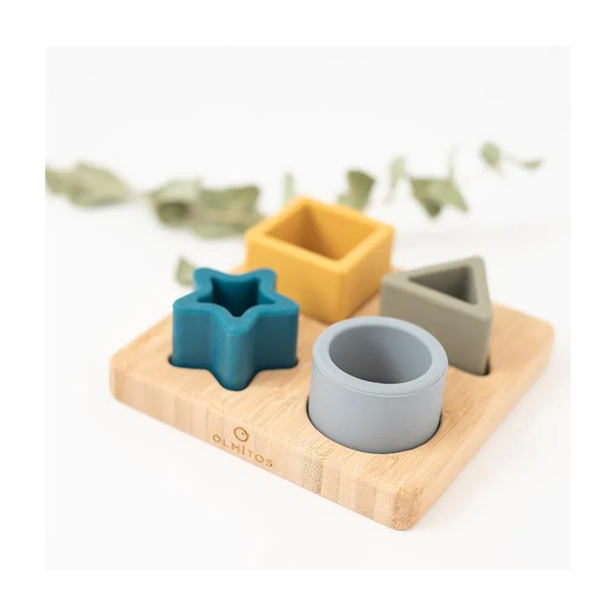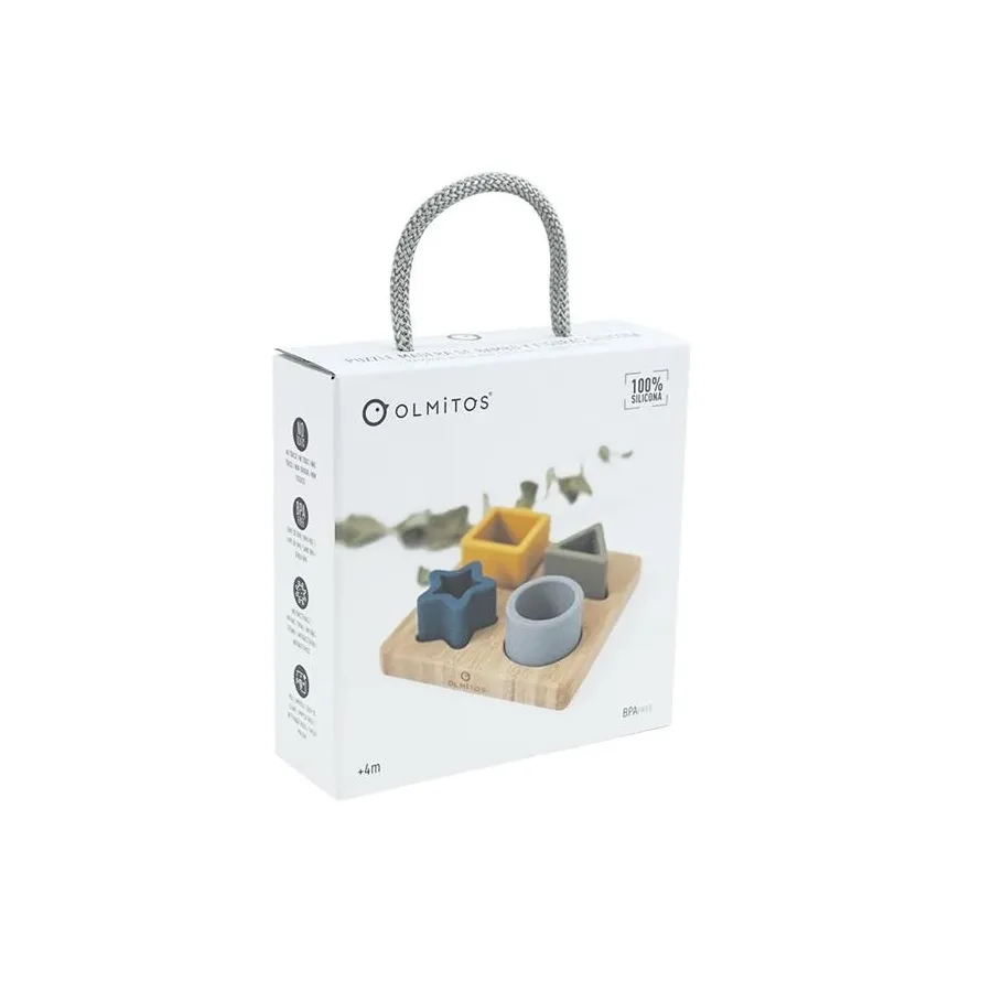 Está formado por 4 piezas geométricas de silicona y una base de madera de bambú. Pensado para jugar a encajar y distinguir los colores y formas de manera lúdica mientras se desarrollan la inteligencia y la motricidad.