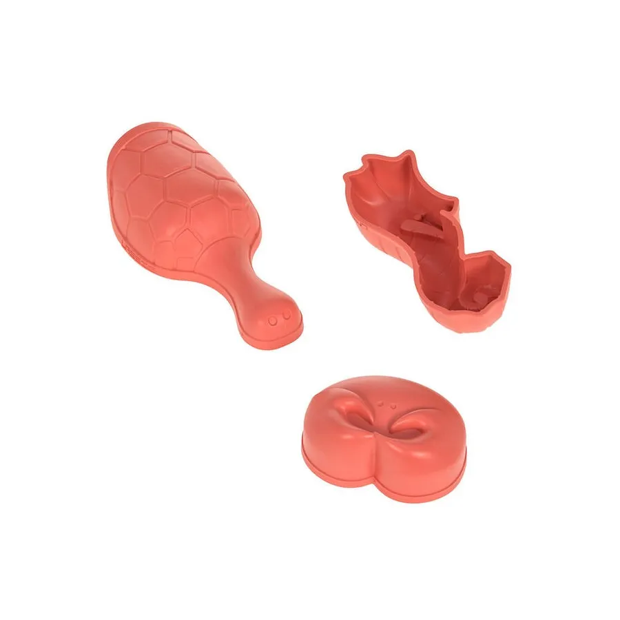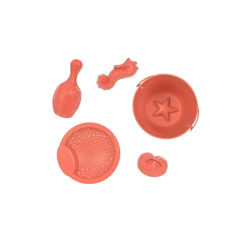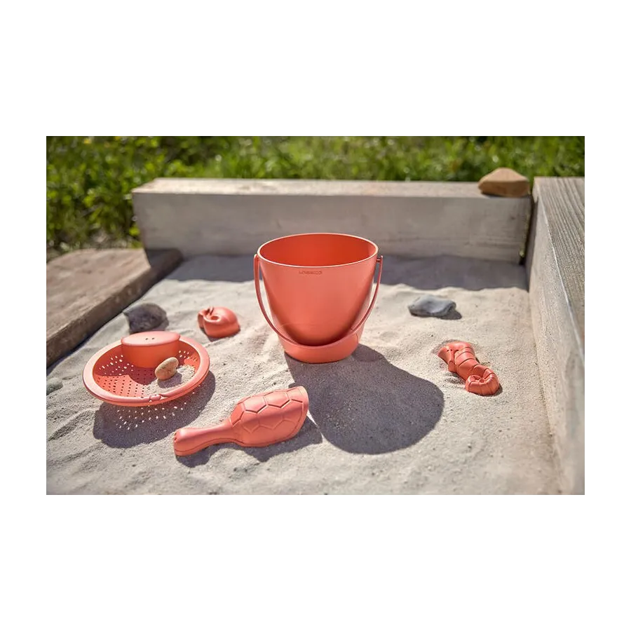 Este precioso set de Lassig está formado por 5 piezas: 1 cubo con asa, dos moldes (uno con forma de caballito de mar y otro con forma de cangrejo), una pala con forma de tortuga y colador con forma de pulpo. En la base del cubo hay incorporado un molde de estrella para empujar y dibujar fácilmente en la arena mojada, ¡Qué divertido!
