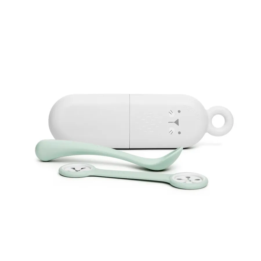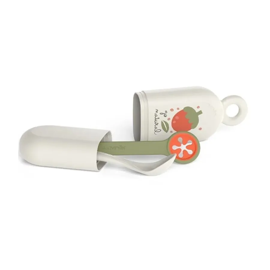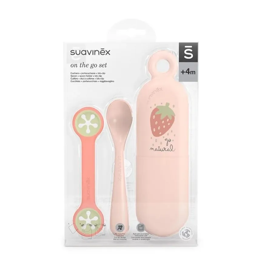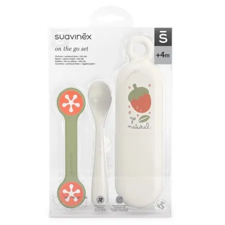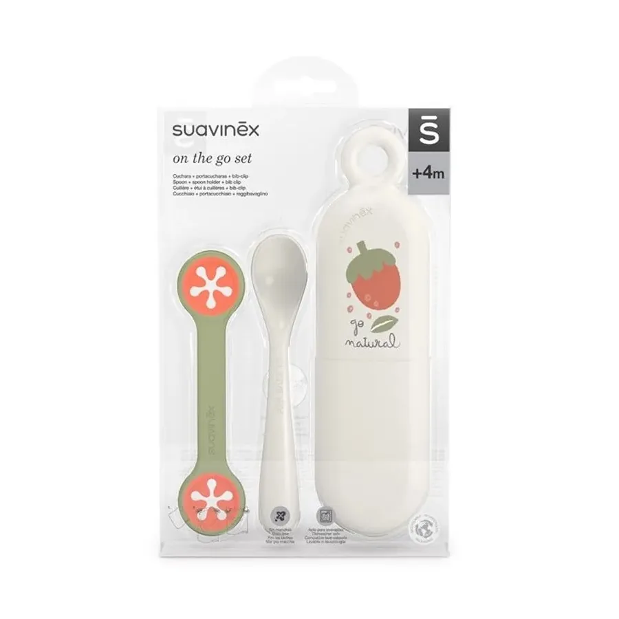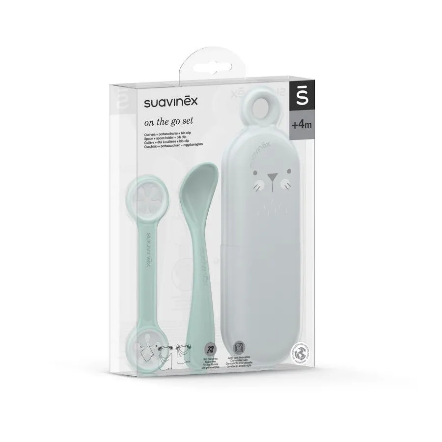El set de cucharas ON THE GO de Suavinex contiene una cuchara ergonómica para fomentar la autonomía del bebé.