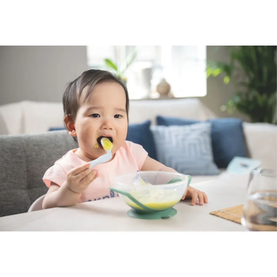 Su forma curvada y orientable ayuda a reducir frustraciones, permitiendo al bebé experimentar sin dificultad y reforzando su confianza durante la alimentación complementaria.