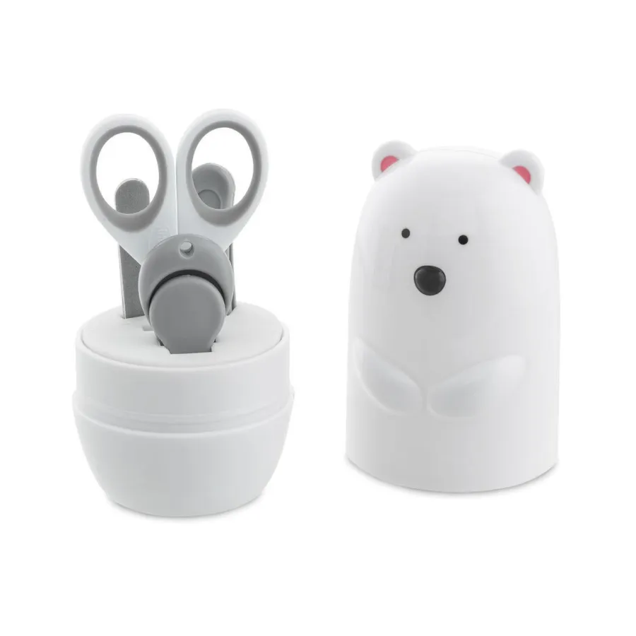 Presentado en un entrañable estuche con forma de oso, este set de manicura 4 en 1 contiene todo lo que necesitas para el aseo y cuidado de las uñitas de un recién nacido.
