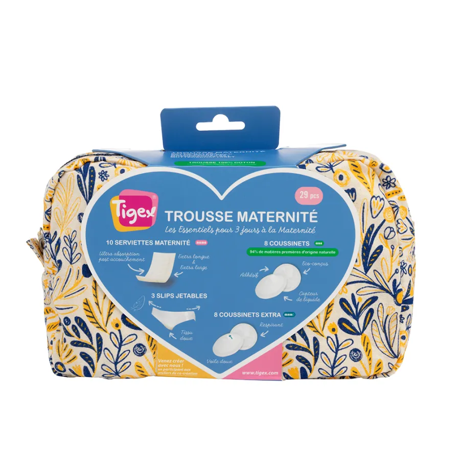 El set de maternidad hospital de Tigex incluye todo lo imprescindible para los 3 primeros días después del parto: