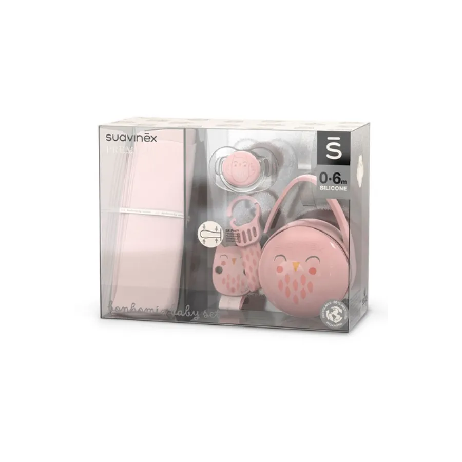 Este completo set de la colección Bonhomía de Suavinex incluye 4 productos imprescindibles para cubrir las necesidades de un recién nacido y es perfecto para regalo. Cuenta con un entrañable diseño de búho en colores pastel muy elegantes que permiten que el bebé esté siempre combinado.