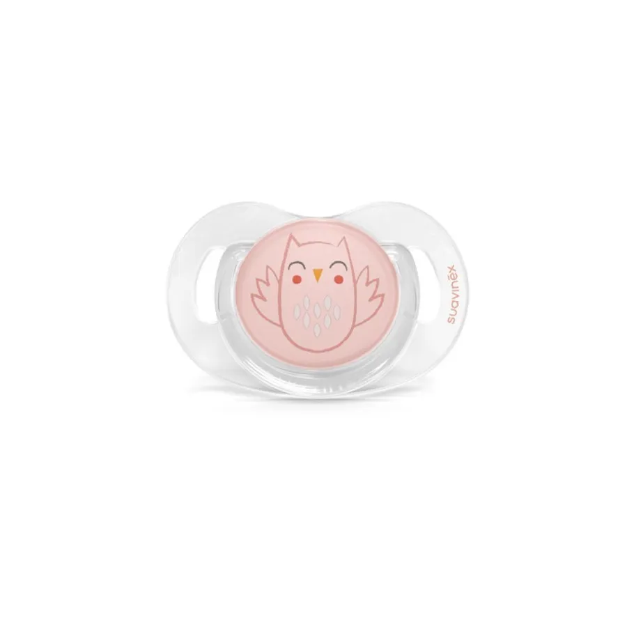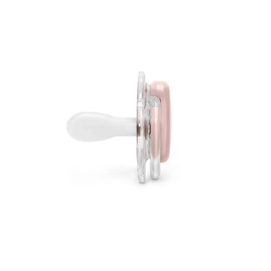 - Chupete con tetina de silicona fisiológica, plana, simétrica y flexible SXpro. Diseñada imitando al pezón materno para respetar el correcto desarrollo del paladar y la cavidad oral del bebé. Cuenta con un aro transparente de sujeción y agujeros de ventilación que impiden las irritaciones.