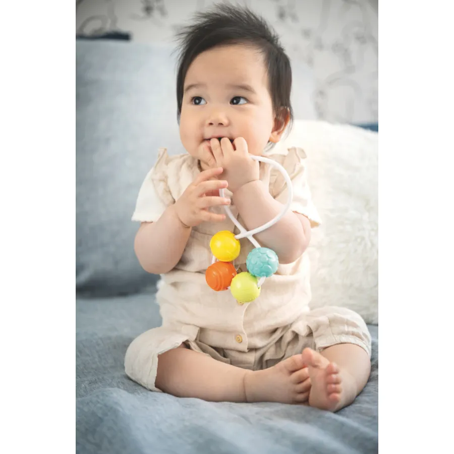 Este juguete sensorial para bebés ha sido diseñado específicamente para estimular los sentidos del bebé de forma natural y divertida. Sus bolas interiores emiten un suave sonido al agitarlo, lo que estimula el oído, mientras que el diseño ergonómico potencia el desarrollo de la destreza manual.